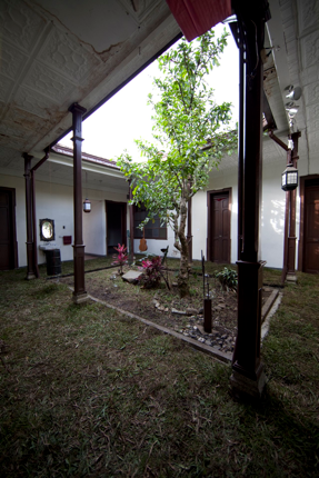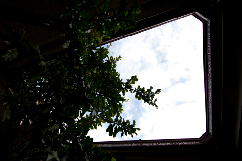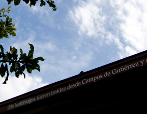 Like a decorative ceramic tile, the white on brown text bordered the upper coving of the gallery’s traditional open courtyard, encircling it on all four sides. The text (also the title) was inscribed in Spanish and was made of a reflective vinyl which glistened by day and glowed by night.