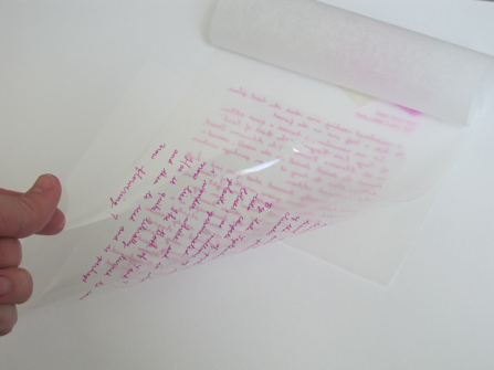 dry letter gloss transfer with silicone coated matt backing tissue, staples, fluorescent pink tape